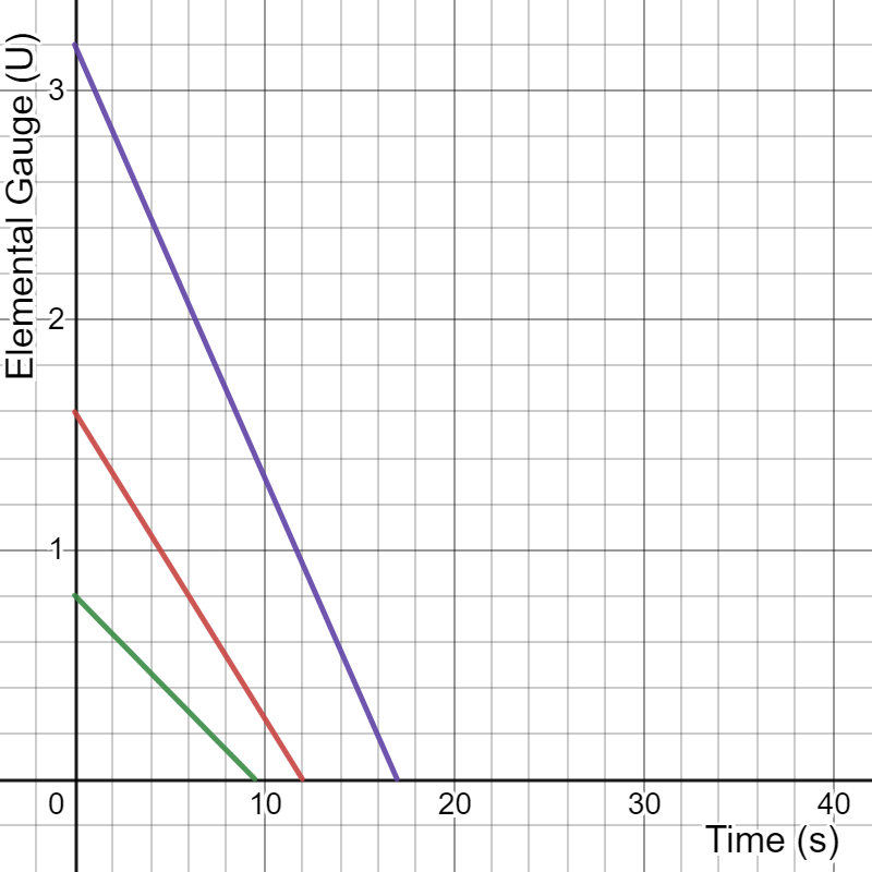 Additional applications of the aura Element will apply their own respective gauges, but follow the decay rate of the original aura. Meaning, a 2U or 4U Elemental Gauge can be decaying at the rate of D(1). To do this, apply a 1U gauge, then apply a 2U or 4U gauge of the same Element to get 1.6U or 3.2U auras that decay by 11.875s per unit.